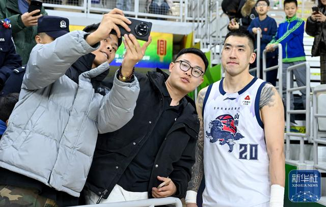 ↑ 山东高速队球员陶汉林(右一)在赛后与观众合影。
